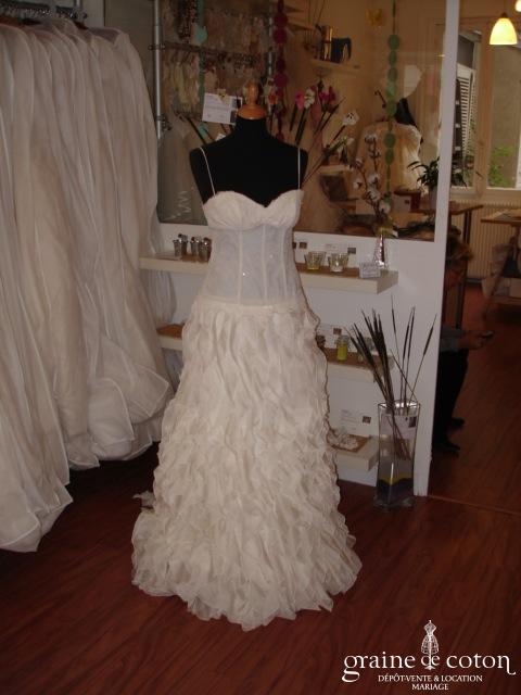 Robe une pièce ivoire : bustier avec fines bretelles et laçage dans le dos, travaillé de fine dentelle. Jupe près du corps en petites lanières d’organza : effet aérien, très léger.Manchettes assorties incluses. Jupon inclus.