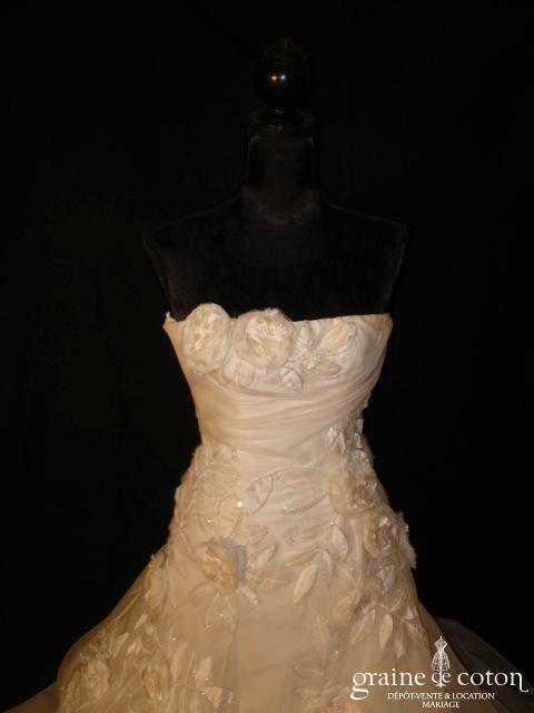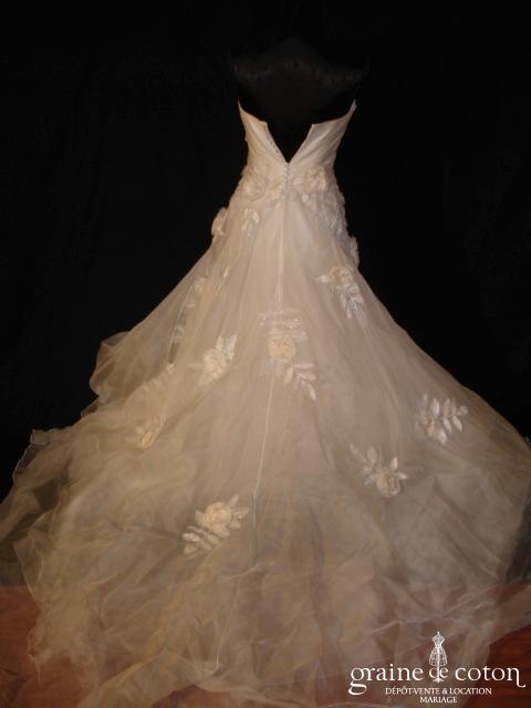 Robe une pièce en organza de soie ivoire : bustier souligné d’un drapé, robe avec applications de feuilles et de fleurs en soie, paillettes, petits boutons le long du dos. Près du corps jusqu’aux hanches puis s’évase en une longue jupe avec traîne. Légère, poétique, une magnifique robe de créateur. Housse incluse.