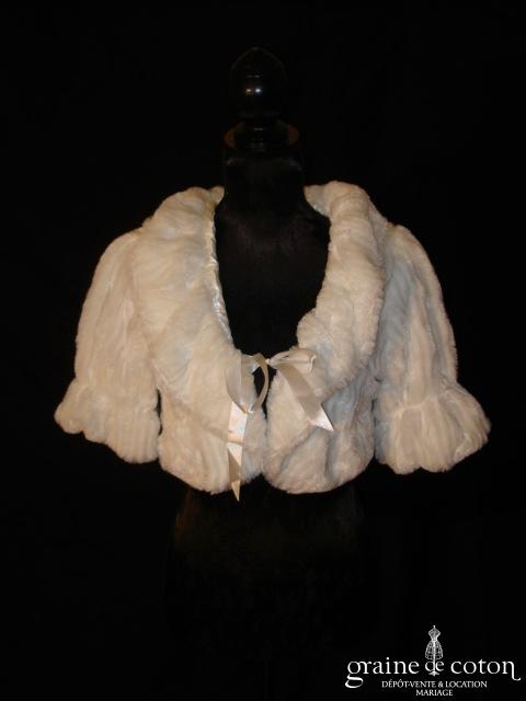Boléro manches 3/4 en fausse fourrure blanche, ruban en satin pour l’attacher. Idéal pour les mariages de mi-saison.