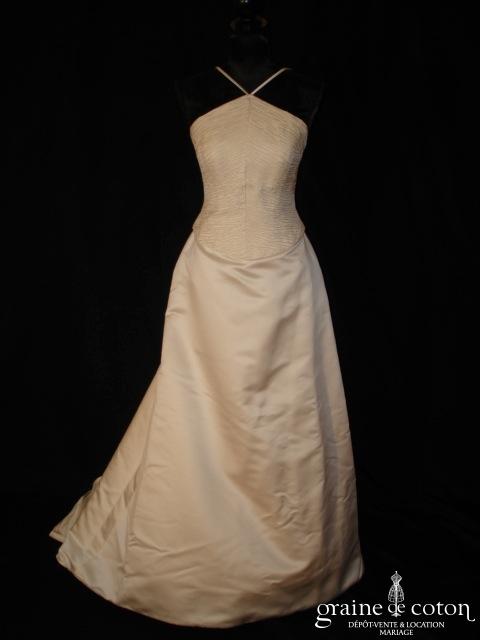 Robe une pièce façon deux pièces : bustier original en pointe avec 2 fines bretelles, plissé. Jupe en satin, forme trapèze, avec longue traîne amovible (s’accroche sous le bustier par des boutons). Sobre et original. Jupon et housse inclus.