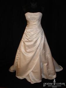 Robe une pièce drapée à la taille : broderies argentées sur de la guipure de dentelle qui descend de façon asymétrique sur la jupe. Touches de perles. Longue traîne pouvant se remonter grâce à un grochet camouflé dans la dentelle dos. Une coupe classique qui avantage la silhouette. Housse incluse.