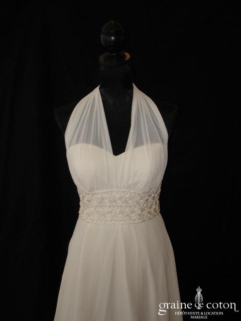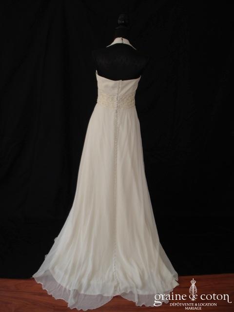 Robe une pièce en mousseline fluide ivoire : taille empire, décolleté en V avec bretelles de mousseline, longue jupe avec traîne, petits boutons tout le long du dos. Étole en mousseline assortie offerte car légèrement tachée. Un modèle original pour une mariée divine ;o) Housse incluse.