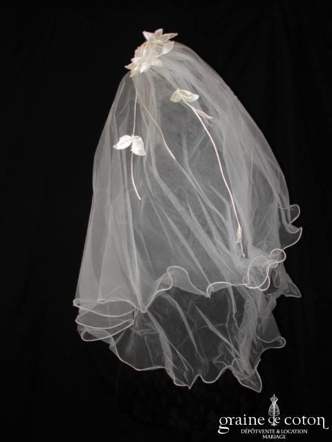 Voile court en tulle ivoire surjeté, orné de fleurs en satin