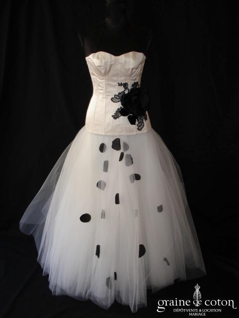 Robe deux pièces noir et blanche : bustier taille basse en satin de soie lacé dans le dos avec grosse fleur noire. Jupe en tulle blanc avec pétales noirs. Très originale, belle coupe.
