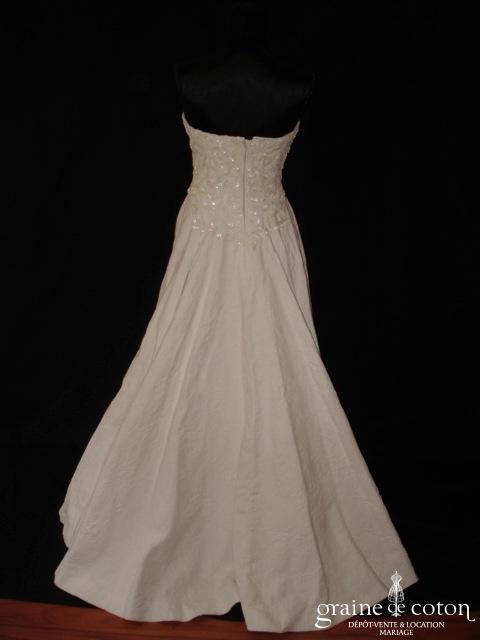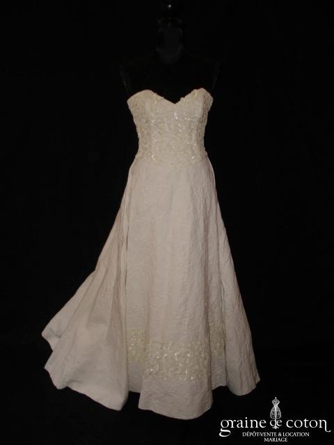 Robe une pièce ivoire : bustier travaillé de paillettes formant des arabesques, jupe en piqué de coton doublée soie, forme trapèze avec petite trapine. Rappel des arabesques en paillettes sur le bas de la jupe. Originale et très habillée, un beau travail haute couture. Jupon inclus.