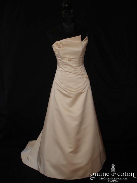 Robe une pièce en satin champagne : bustier asymétrique orné de quelques fleurs en tissu ton sur ton, très discrètes. Dos avec boutons recouverts le long de la fermeture. Jupe forme trapèze légèrement évasée avec petite traîne. Simple et élégante. Jupon inclus.
