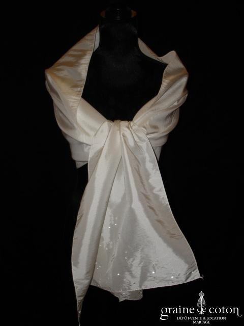 Étole en taffetas ivoire clair, idéalement assortie à la robe Athéna référence 1390. Petites perles en bout d’étole. Dimensions : 150*200 cm.