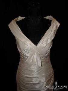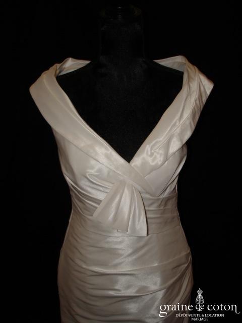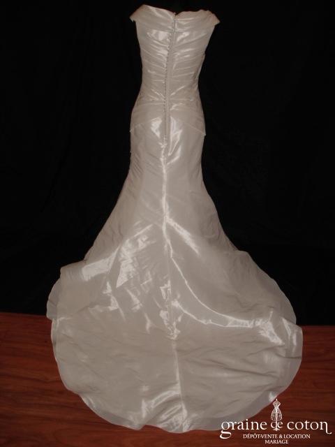 Robe une pièce en taffetas ivoire : encolure très originale qui tombe sur les épaules, croisée sur le décolleté. Drapé à la taille, jupe sirène avec longue traîne. Un beau modèle épuré et élégant. Jupon inclus.