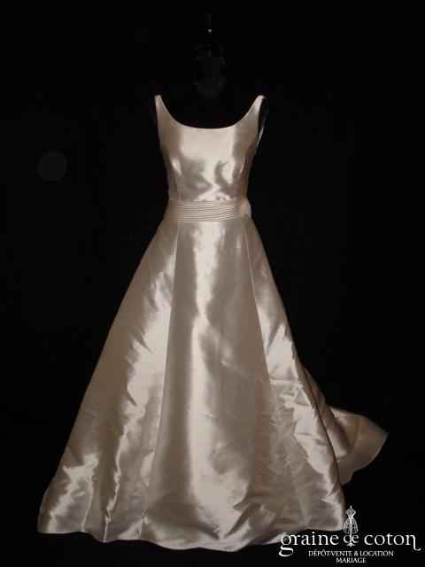 Robe une pièce en mikado ivoire : décolleté bateau avec bretelles, jupe trapèze épurée, dos boutonné, taille soulignée d’une ceinture style « kimono ». Un modèle épuré et original.