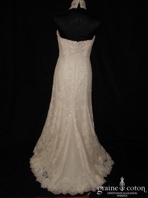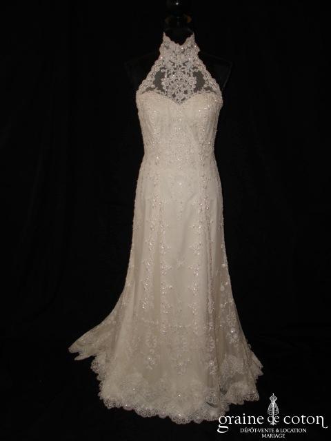 Robe une pièce en dentelle champagne : bustier avec encolure tour de cou en dentelle, coupe fourreau s’évasant au genou. Très belle matière, tombé fluide. Voile assorti disponible sous la référence 1469. Housse incluse.