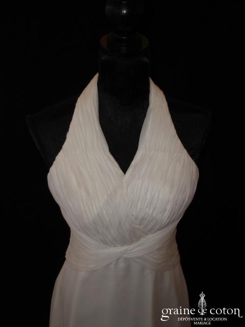 Robe une pièce en mousseline de soie plissée ivoire : bustier taille empire soulignée d’un drapé avec bretelle tour de cou et décolleté en V. Jupe fluide avec traîne pouvant se remonter. Dos boutonné. Un modèle épuré et très élégant. Boléro assorti disponible sous la référence 1494. Housse incluse.