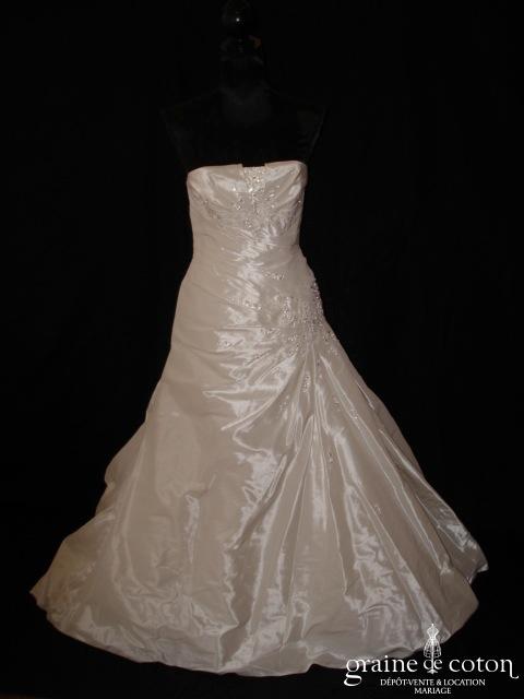 Robe une pièce en taffetas ivoire : bustier drapé brodé de perles, taille basse drapée, jupe s’évasant en trapèze. Dos avec boutons. Sobre et très élégante avec son perlage donnant de l’éclat. Traîne pouvant se relever par un système de rubans. Housse incluse.