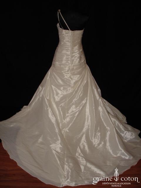 Robe une pièce façon soie sauvage ivoire : bustier drapé taille basse avec une bretelle traversante plissée, dos boutonné. Jupe s’évasant en un beau drapé asymétrique, longue traîne. Un modèle épuré très élégant.