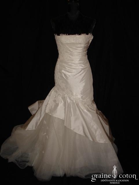 Robe une pièce en taffetas et tulle ivoire clair : bustier drapé avec guipure de dentelle, jupe taille basse ouverte sur un côté, laissant apparaître tulle et dentelle. Un modèle très féminin avec de belles matières.