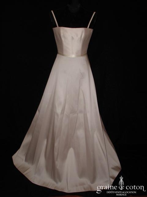 Robe une pièce en mikado violine : bustier travaillé en plusieurs pans, fines bretelles, double ceinture de satin à la taille et dos lacé avec profond décolleté. Jupe forme trapèze avec petite traîne. Style épuré, belles matières, élégance garantie !