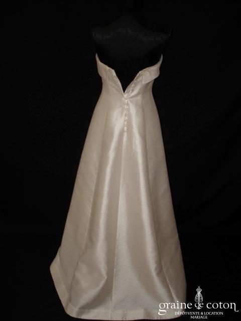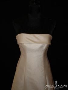Robe une pièce en mikado ivoire : bustier avec revers, petits boutons dans le dos, jupe trapèze. Robe épurée, belle coupe, pour une mariée tout en élégance et sobriété. Housse incluse.