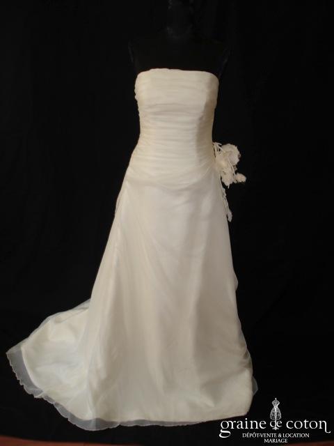 Robe une pièce en organza ivoire : bustier drapé taille basse, jupe trapèze fluide. Broche fleur au niveau de la taille, possibilité de la déplacer ou de l’ôter. Petite traîne qui peut se relever par un système de rubans. Un modèle léger qui met en valeur la silhouette. Housse incluse.