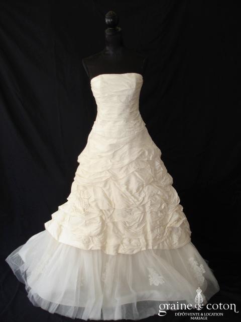 Robe deux pièces en taffetas de soie plissé ivoire : bustier drapé lacé dans le dos avec bretelles amovibles. Jupe trapèze relevée sur un large volant de tulle et guipure de dentelle. Volume et légèreté pour cette robe de mariée moderne. Housse incluse.