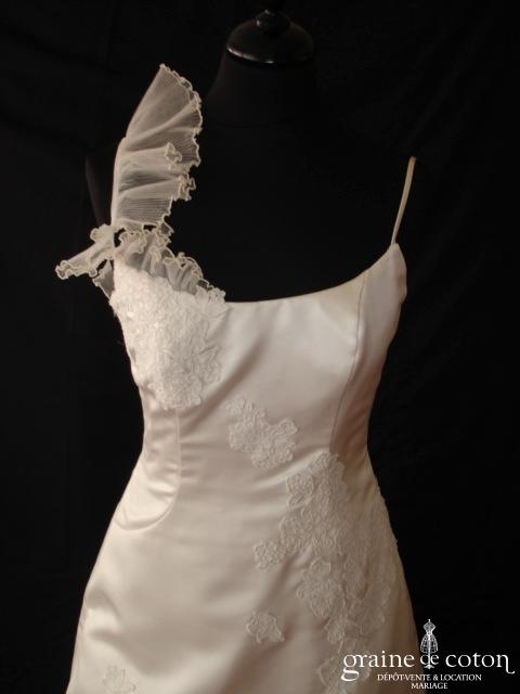 Robe une pièce ivoire clair : bustier en satin et guipure de dentelle avec fines bretelles dont une ornée d’un volant d’organza plissé, dos boutonné. Jupe sirène en satin avec sous jupe en organza plissé, tulle et dentelle : « faux-cul » relveé en forme de rose sur les volants de dentelle et d’organza. Belles matières et coupe très originale.