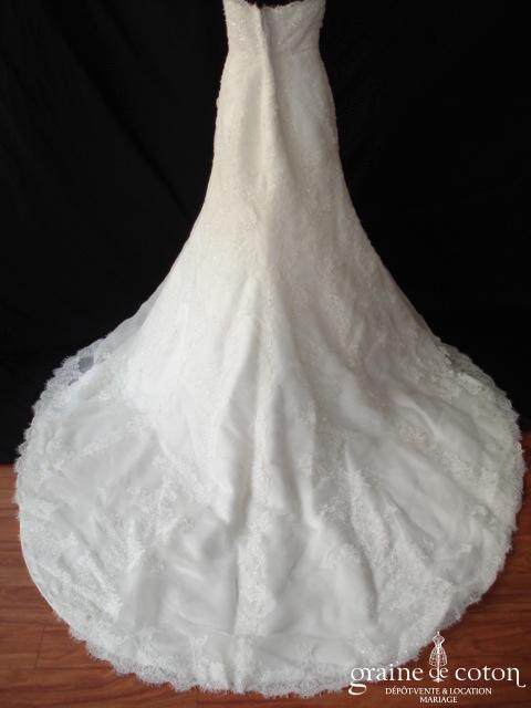 Robe une pièce taille en dentelle ivoire clair : bustier taille empire, jupe fourreau s’évasant en une longue traîne que vous pouvez remonter par un système de rubans. Belle dentelle, coupe élégante.