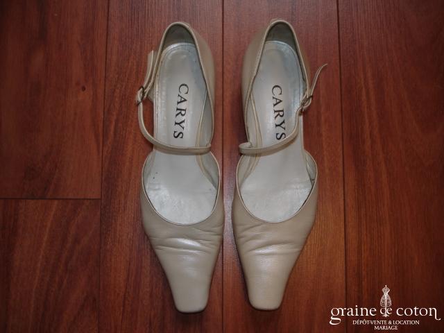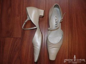 Escarpins en cuir ivoire, bout carré, petit talon de 3 cm. Lanière entourant le pied pour un bon maintien.