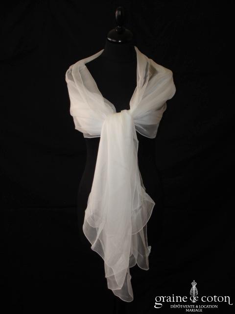 Étole en mousseline de soie ivoire clair, bords surjetés. Dimensions : 110*200 cm.
