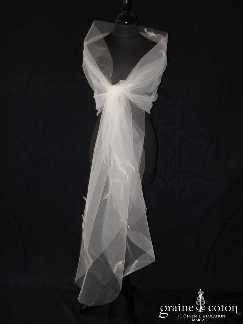 Étole en tulle ivoire avec plumes. Dimensions : 70 cm * 300 cm.