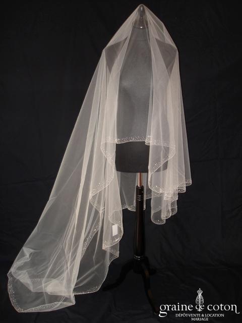Voile long de 3 mètres (largeur 2 mètres) en tulle ivoire bordé de perles et cristaux. Non monté sur peigne : à fixer avec des pics à chignon, permet de régler la longueur avant.