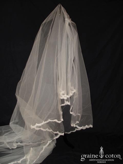 Voile long en tulle rigide ivoire long de 3 mètres avec rabat avant de 85 cm en plus. Bordé d’un fin galon de dentelle et monté sur peigne.