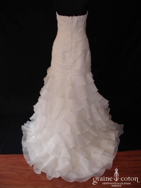 Robe une pièce taille basse : bustier en dentelle brodée de perles discrètes. Juoe fourreau s’évasant en volants d’organza, traîne. Tombé léger et élégant. Housse incluse.