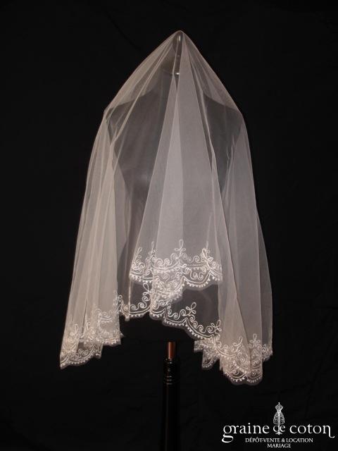 Voile mi long d’une longueur totale de 2 mètres en tulle ivoire (rabat avant inclus), brodé sur les bords. Non monté sur peigne, à piquer dans la coiffure.