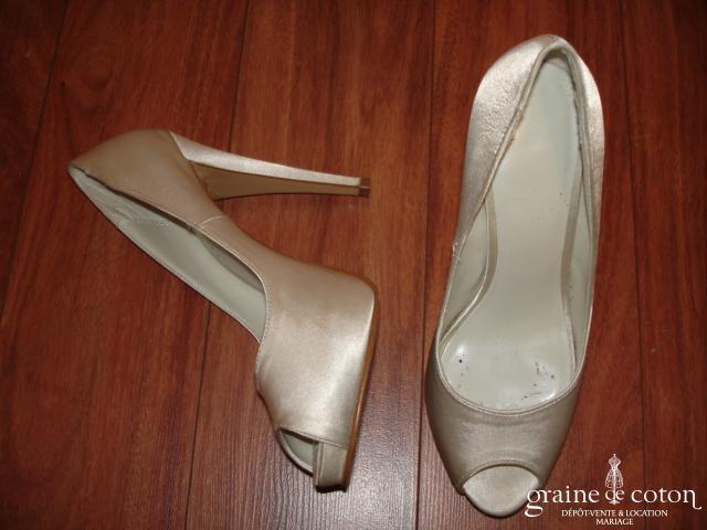 Escarpins à bouts ouverts recouverts de satin ivoire. Talons de 12,5 cm avec avant compensé 2,5 cm.