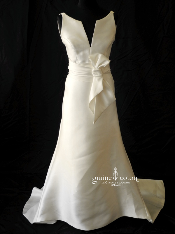 Robe une pièce en mikado de soie ivoire clair : bustier avec bretelle, décolleté en V devant et fente profonde dans le dos. Ceinture drapée avec gros noeud à fixer à la taille. Jupe sirène près du corps avec traîne pouvant se relever par un système de boutons. Un modèle pur et classe. Housse incluse. Boléro assorti disponible sous la référence 2024.