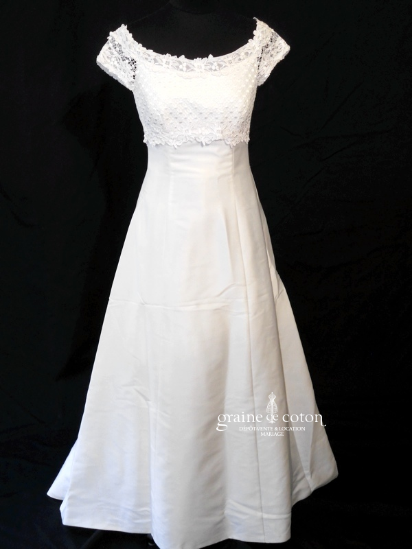 Robe une pièce en mikado ivoire : bustier taille empire avec dentelle crochet, petites manches courtes, dos lacé. Jupe trapèze en mikado , très sobre. Robe fraîche, facile à porter.