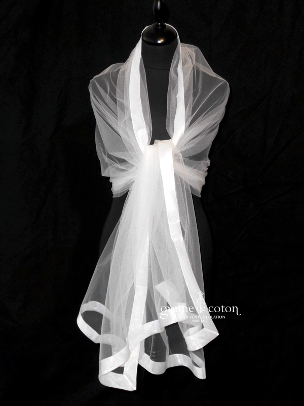 Étole en tulle ivoire, bordée d’un bais d’organza. Dimensions : 200*120 cm.