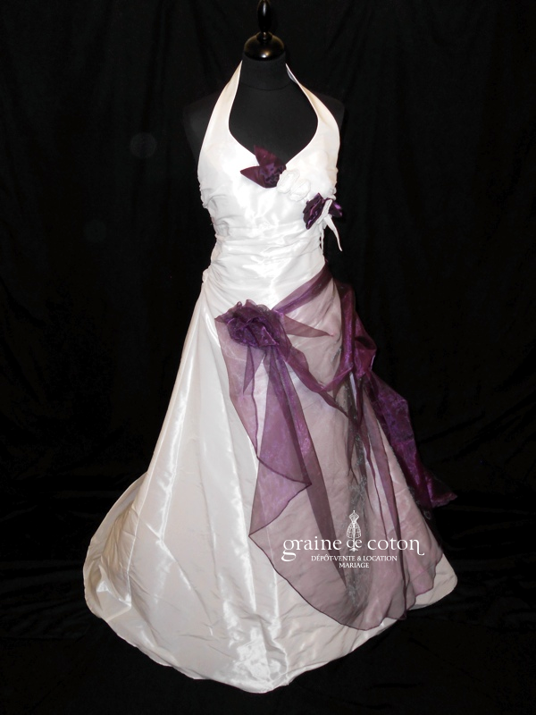 Robe une pièce en taffetas drapé ivoire clair : bustier avec bretelle/col tour de cou, en V, orné de roses en taffetas ivoire et violet. Dos lacé d’un ruban violet, que l’on peut changer. Jupe trapèze avec traîne pouvant se remonter par un système de rubans, drapée d’organza violet (possibilité de le retirer). Housse et jupon inclus.