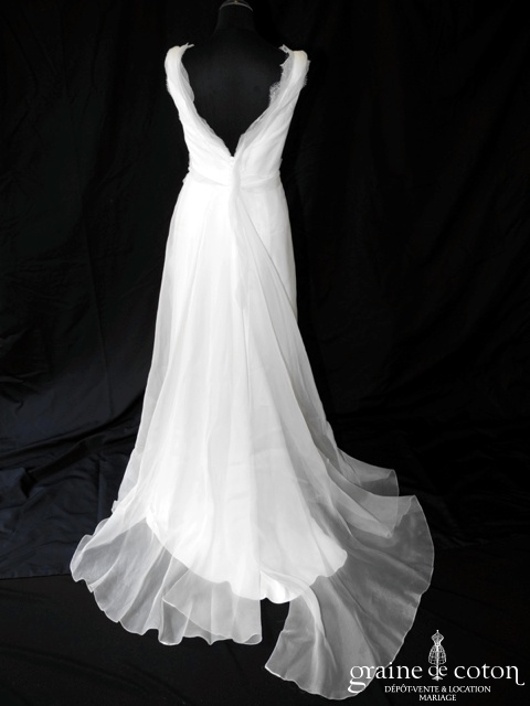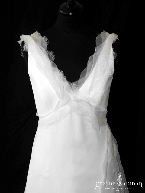 Robe une pièce en crêpe de soie ivoire clair : bustier empire avec larges bretelles, décolleté en V bordé d’un volant de dentelle et d’organza de soie façon pétales. Dos en V profond boutonné. Jupe fluide recouverte d’organza de soie avec petite traîne d’organza pouvant se relever par un système de petits rubans. Légère, fraîche, belles matières. Housse incluse.
