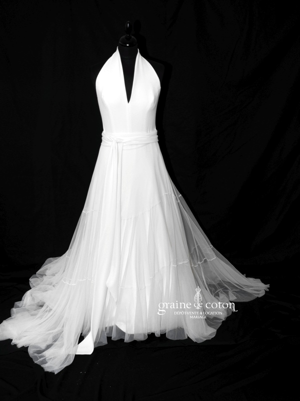 Robe une pièce en crêpe ottoman ivoire : bustier tour de cou avec décolleté profond en V, jupe fluide en crêpe retombant sur un jupon souple de tulle que vous pouvez aussi mettre au-dessus de la robe et enlever pour la soirée. Système de boutons et lanières pour relever les traînes. Un beau modèle de créateur, classe et épuré.