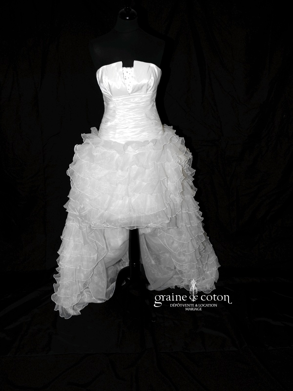 Robe une pièce ivoire : bustier empire drapé en taffetas ivoire clair, ouvert en V sur un triangle de perles et strass. Dos lacé. Jupe courte devant en volants d’organza façon volutes. Longue traîne pouvant se remonter par un système de boutons. Originale, légère et élégante ! Housse incluse.