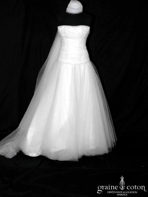 Robe deux pièces en papier de tulle « tyveck » : bustier drapé avec dos lacé caché par un boutonnage. Jupe évasée en papier tulle, beau volume et mouvement léger. La ceinture élastique permet de s’adapter à votre tour de taille facilement. Une robe originale et écolo ! Étole / voile de 4 mètres incluse.