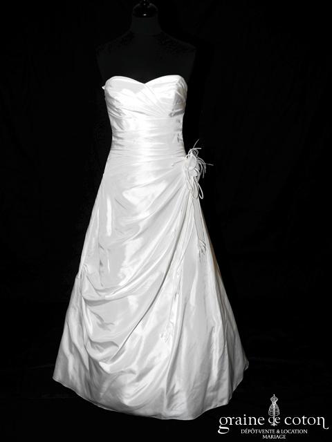 Robe une pièce en taffetas ivoire : bustier coeur drapé, jupe trapèze avec petite traîne, fleur à la taille (pouvant être ôtée/remplacée). Robe légère et seyante. Housse et jupon inclus.