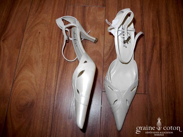 Escarpins en cuir ivoire, bout pointu, lanière tour de cheville. Talon de 7 cm.