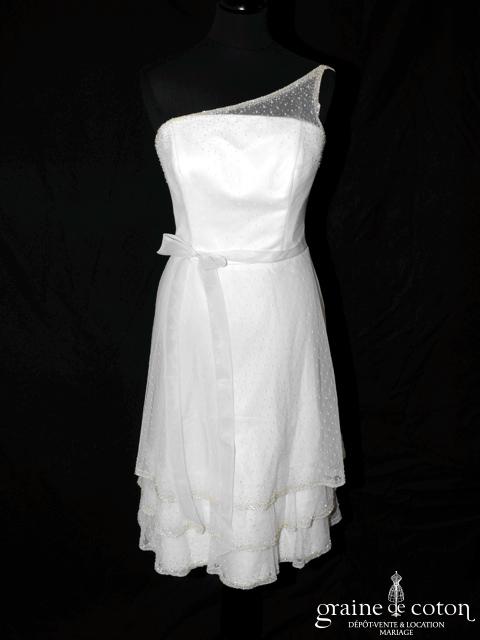 Robe courte en satin ivoire recouvert de tulle plumetis perlé sur les ourlets. Une bretelle asymétrique et une ceinture en organza à la taille apportent toute son élégance au modèle. Idéale pour une cérémonie civile.