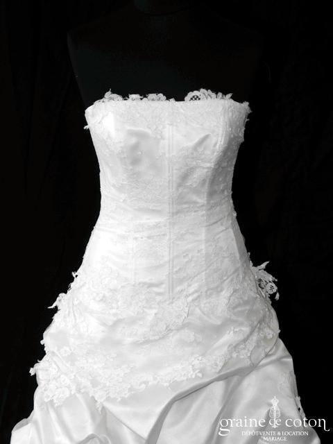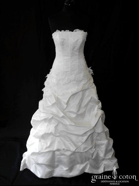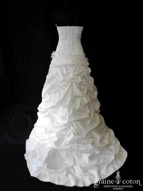 Robe une pièce ivoire : bustier avec guipure de dentelle de Calais, dos lacé. Jupe taille basse forme trapèze drapée de dentelle en rappe du bustier, remontées en taffetas et organza pour un beau volume. Traîne pouvant se remonter par un système de rubans. Belles matières et joli tombé. Housse et jupon inclus.