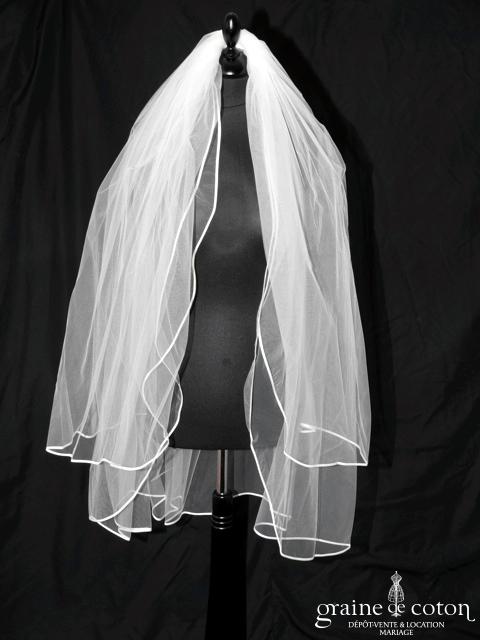 Voile mi long, aux cuisses, en tulle blanc bordé d’un biais de satin. Monté sur peigne, avec rabat avant quasi aussi long que celui arrière.