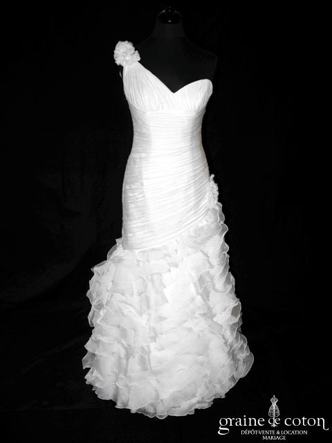 Robe une pièce en organza ivoire clair : bustier drapé, décolleté coeur avec une bretelle ornée de fleurs en tissu et perles transparentes. Dos boutonné. Jupe fourreau avec volants d’organza, traîne pouvant se remonter par un système de crochet. Coupe seyante, beau tombé. Jupon inclus.
