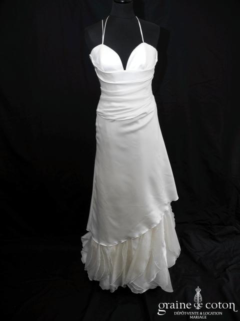 Robe une pièce en satin duchesse ivoire : bustier avec décolleté en V et bretelles croisées dans le dos, drapé à la taille. Dos boutonné. Jupe sirène dont le pan de satin s’ouvre sur des pétales d’organza gaufré, pas de traîne. Originale et seyante.