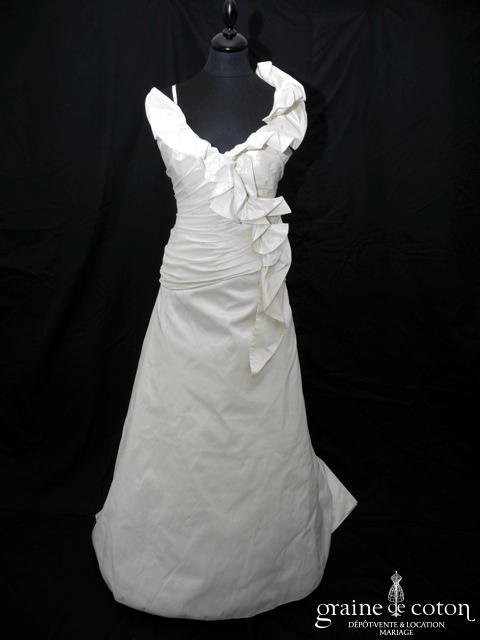 Robe une pièce en taffetas drapé ivoire : bustier avec bretelles parées d’un large double volant de taffetas asymétrique. Jupe trapèze avec petite traîne. Originale, moderne et seyante.