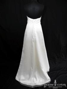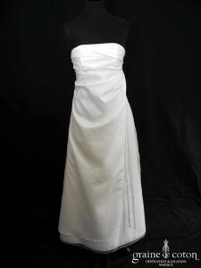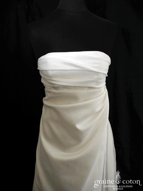 Robe une pièce en flammé ivoire : bustier empire drapé, dos échancré. Jupe trapèze s’évasant suffisamment depuis la poitrine pour convenir à une mariée future maman ;o) Sous jupe en organza et petite traîne. Longs rubans de satin partant du bustier. Élégante et légère.