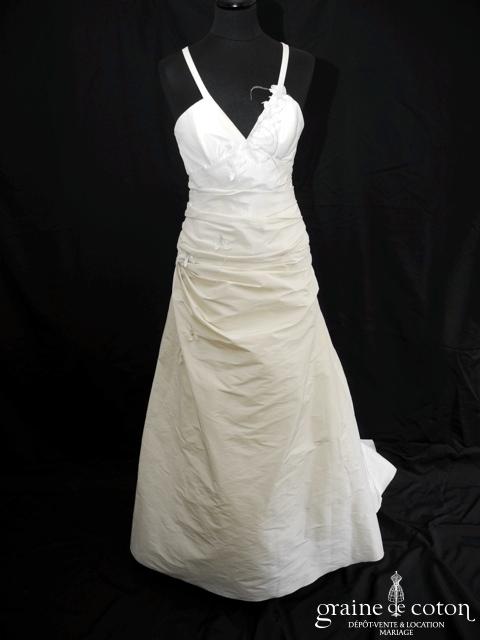 Robe une pièce en taffetas ivoire : bustier en V avec bretelles croisées dans le dos, drapé à la taille. Dos boutonné. Jupe trapèze avec guipure de dentelle et fines plumes, petite traîne. Très seyante.